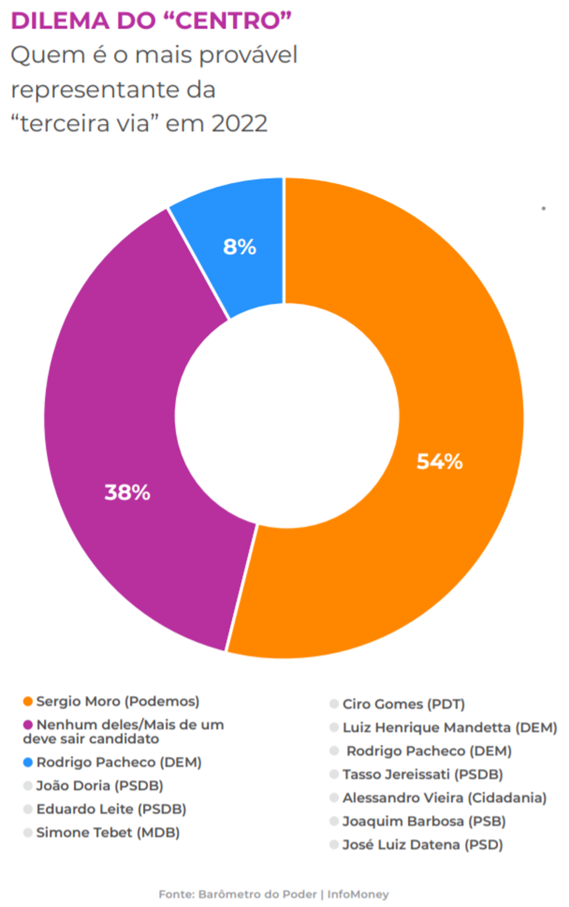 Outros 38% acreditam que nenhuma das opções até o momento colocadas terá condições de ocupar o espaço de líder da “terceira via” e em condições de tirar Lula ou Bolsonaro do segundo turno da corrida ao Palácio do Planalto. Para 8%, os ventos podem soprar a favor de Rodrigo Pacheco (PSD-MG), presidente do Senado Federal.
