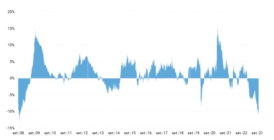 Podemos observar o spread dentre o CDI e o resultado do IHFA (Índice de Hedge Funds da Anbima). Como podemos observar, esse gráfico não ficava feio assim desde a grande crise do subprime.