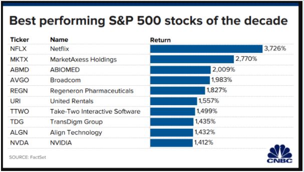 O terceiro motivo está no acesso à tecnologia e à inovação. Todas as empresas que protagonizam a quarta revolução industrial estão listadas fora do Brasil, e, como esperado, são as companhias que tiveram maior alta na última década no S&P. Dessa lista abaixo, pelo menos 7 estão intimamente ligadas à tecnologia.