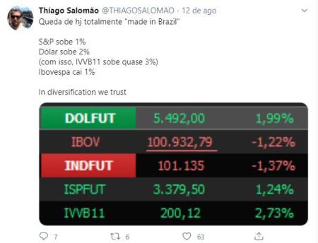 Em segundo, o investidor pode ser defender daquelas crises que são bem brasileiras. Nessa semana mesmo tivemos um solavanco bem verde e amarelo na Bovespa quando o Ministério da Economia perdeu Salim Mattar e Paulo Uebel. Esse tuíte do Salomão vale mais que mil palavras: