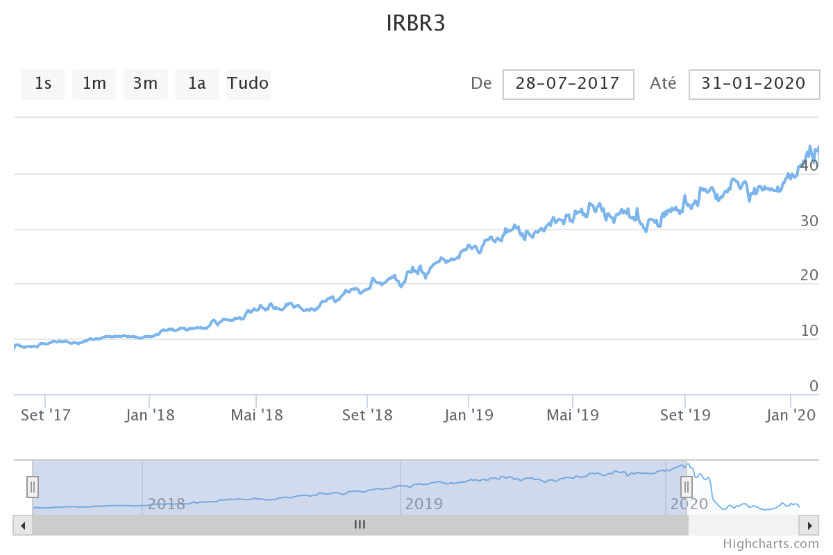 Abaixo, o gráfico da ação de IRB de julho de 2017 até janeiro de 2020. De tão ‘previsível’, é difícil acreditar que estamos falando de uma ação, ainda mais negociada em uma bolsa tão volátil como a brasileira.